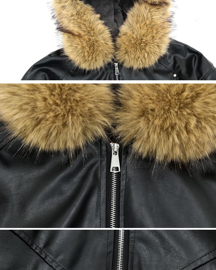 Faux Fur Hooded PU Leather Bomber Jacket