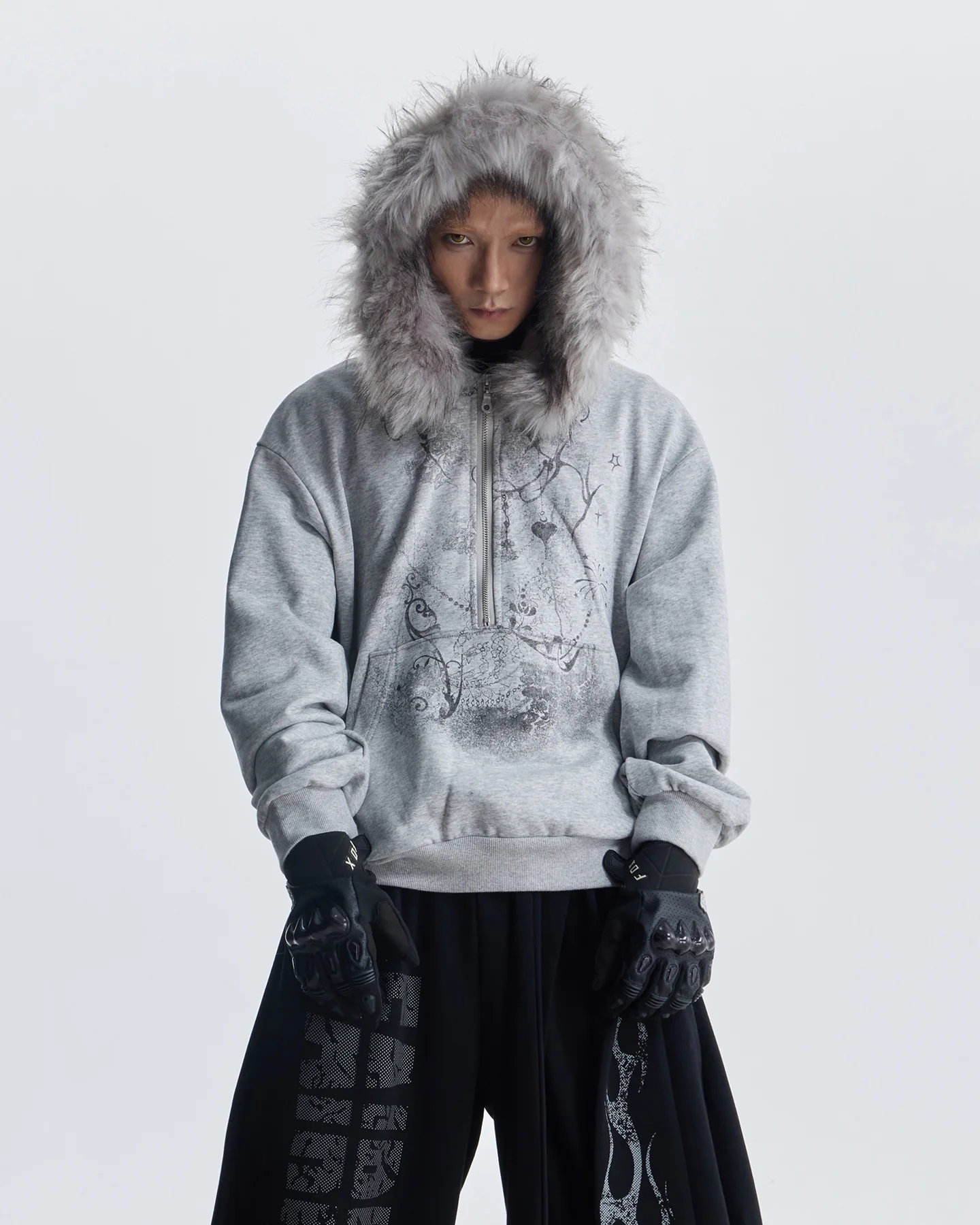 Design Elements: Fuzzy fabric, printed design, half-zip front, cropped cut, relaxed hooded silhouette