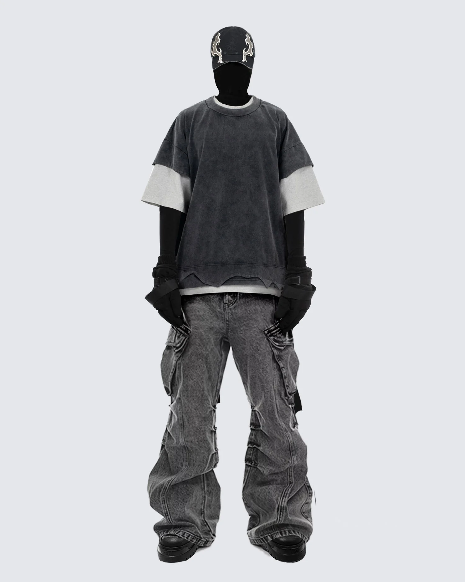 Washed and distressed finish, stacked silhouette, multiple cargo pockets, loose fit, vintage street vibe